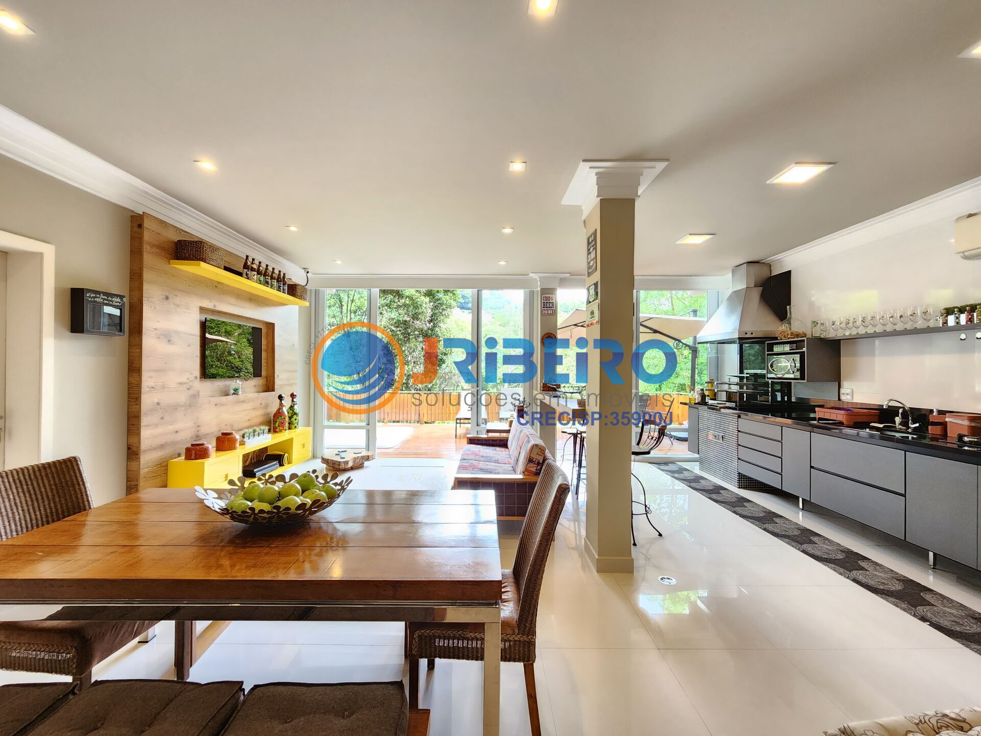 Casa em condomínio à venda com 4 dormitórios sendo 3 suítes, 3 vagas de garagem, salão com espaço gourmet integrado com deck e jacuzzi (Spa), hall de entrada, living para ambientes integrados como sala de estar, sala de jantar, sala de lareira com uma belíssima vista da área verde preservada, escritório, moderna cozinha repleta em armários planejados, lavabo, lavanderia e corredor lateral.